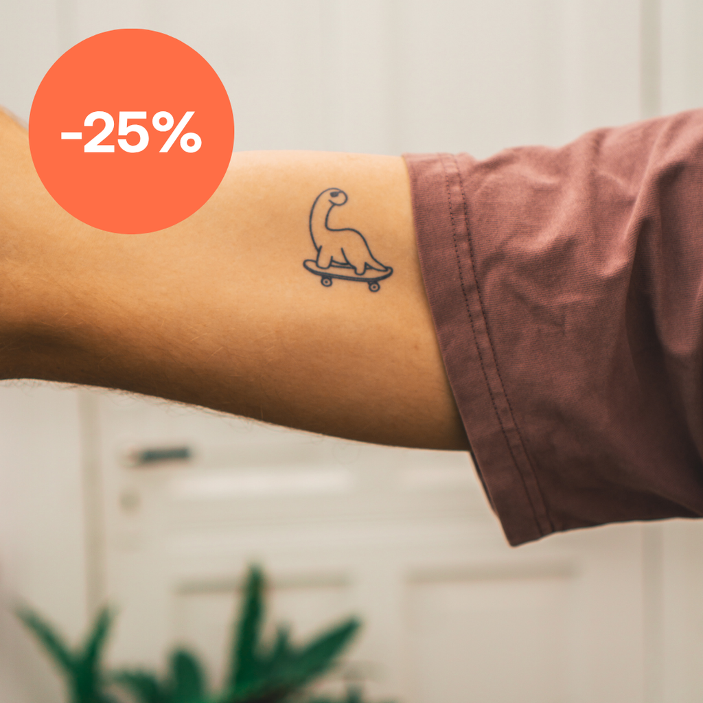 The Cooler Dino is not just a temporary tattoo, but a symbol with a deep and meaningful history. This motif embodies strength, a sense of adventure, and the desire to stand out from the crowd. The dinosaur has always been a fascinating creature that sparks the imagination of people. With its cultural roots and historical references, the Cooler Dino symbolizes the prehistoric era and a world full of unknown beauty. It reminds us that we can thrive in a constantly changing world, and that we are brave enough to forge our own paths. The Cooler Dino can be placed on the body in various ways. Whether on the arm, shoulder, or back - this tattoo attracts attention wherever it is placed. It is a real eye-catcher for larger areas like the stomach, while it has a more subtle effect on smaller, finer areas like the neck or foot. The placement depends on your personal style and preferences. Styling tips? The Cooler Dino adds a special touch to any outfit. Whether you wear it to sports events, while shopping, or on your vacation travels - this tattoo is a versatile accessory that complements your style. Pair it with casual clothing for a relaxed look, or wear it to a chic evening event to give your outfit an individual touch. This tattoo is suitable for anyone looking to express their personality. It is perfect for young people who choose to avoid permanent tattoos or simply want to try out a tattoo. The Cooler Dino fits a variety of interest groups and events. Whether you are a sports enthusiast who wants to stand out at every game, or an adventurer traveling the world - this tattoo is made for you. Discover the freedom of temporary tattoos with the Cooler Dino from Inkster. Let your individuality shine and find the courage to forge your own path. With this tattoo, you can showcase your sense of adventure and stand out from the crowd. Choose Inkster for high-quality, 2-week tattoos that inspire you and express your personality.